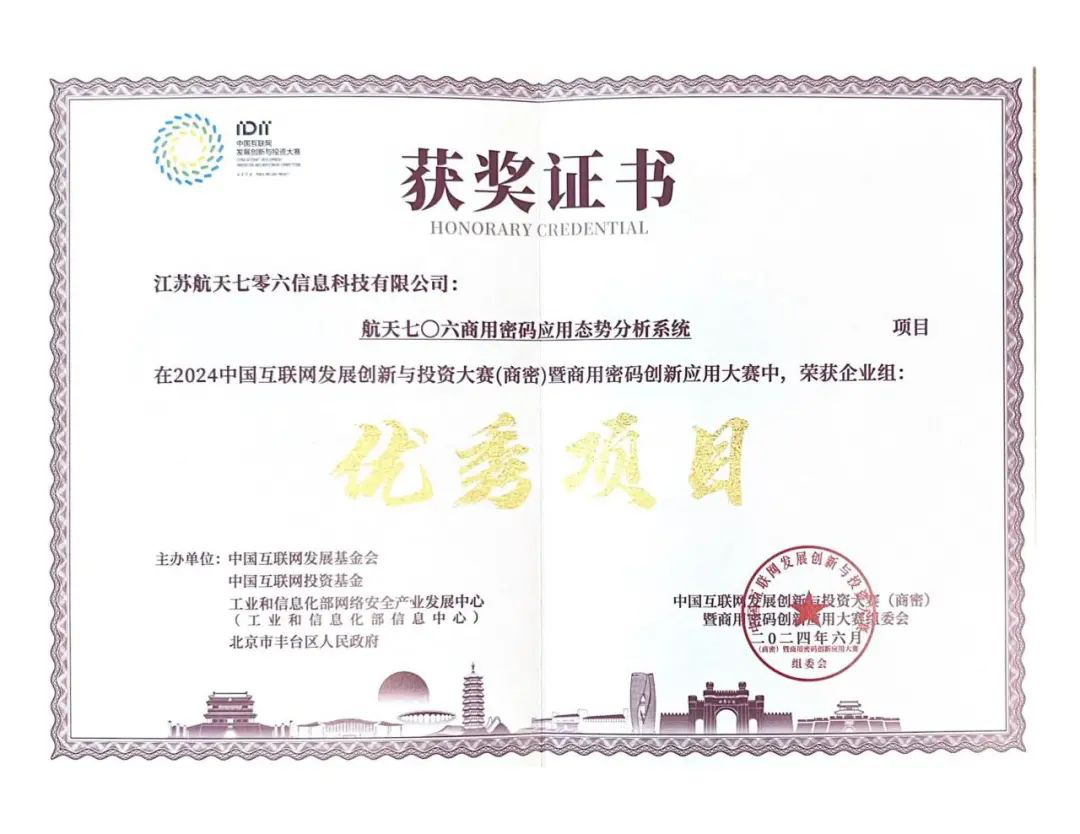 近日,2024中國互聯網發展創新與投資大賽(商密)暨商用密碼創新應用大賽圓滿落幕。航天二院706所江蘇公司“航天七〇六商用密碼應用態勢分析系統”榮獲企業組優秀項目獎,充分彰顯了該公司在商用密碼領域突出的技術實力和創新能力。