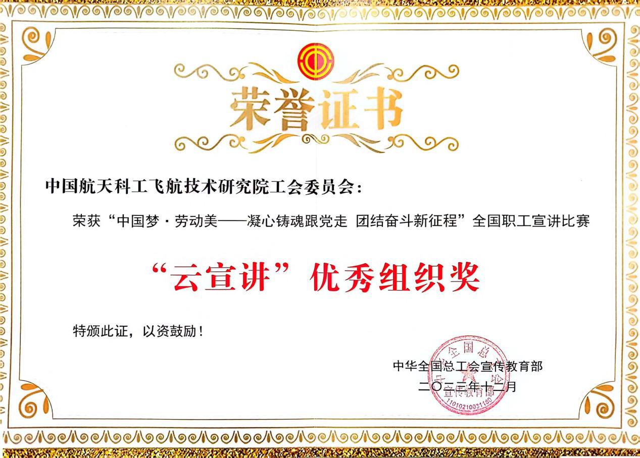 近日,全國總工會宣傳教育部下發《關于“中國夢·勞動美——凝心鑄魂跟黨走 團結奮斗新征程”全國職工宣講比賽“云宣講”獲獎情況的通報》,中國航天科工三院工會獲得優秀組織單位,也是航天系統唯一獲此殊榮的單位。此次評選,共有15家地市級工會及15家機關企事業單位獲獎。